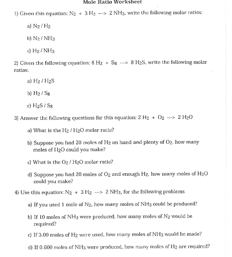 The product stream consists of pure ammonia. Mole Ratio Worksheet - Oswego Community. The pressure on each side of the box is 1 atm.